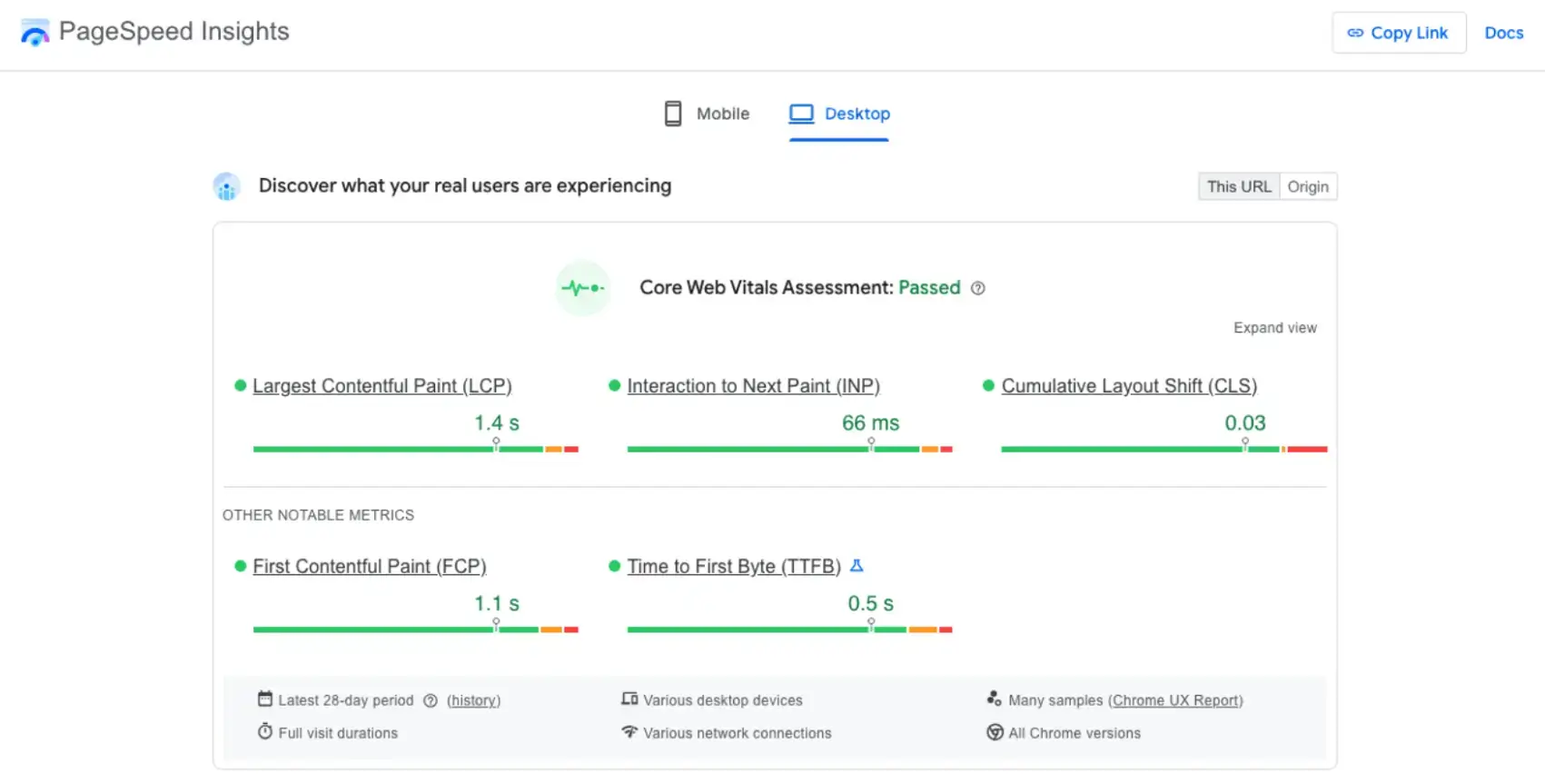 To avoid this outcome, the best tool you can use is Google’s PageSpeed Insights. It’s free, highly informative, and provides actionable tips on high-value activities that can improve web performance.