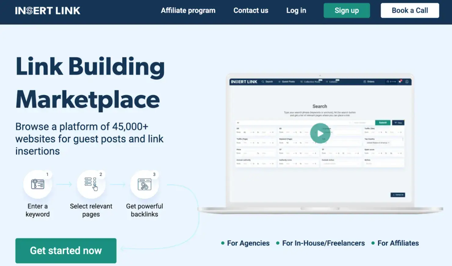 INSERT.LINK is a backlink marketplace platform with 45,000+ websites in its database. You browse sites upfront with clear pricing and placement rules, then use NLP-based search and filters to quickly shortlist relevant options across 30+ geos.