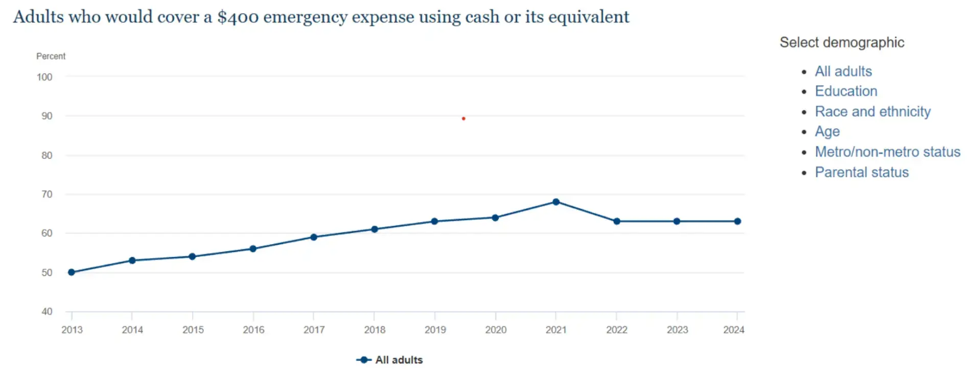 According to the Federal Reserve’s Survey of Household Economics and Decisionmaking, 63% of adults said they would cover a hypothetical $400 emergency expense using cash or its equivalent.