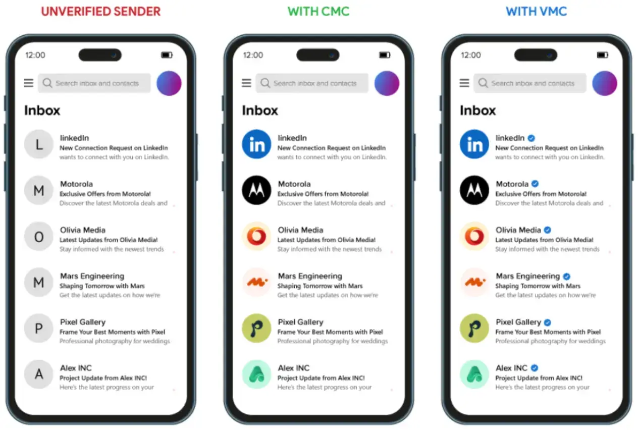 This creates a trust boundary where only compliant senders gain visibility. The presence of a verified logo helps users quickly distinguish authentic communications from impersonation attempts, reducing reliance on guesswork.