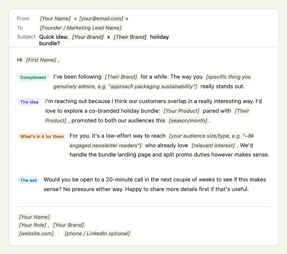 - Subject line: Keep it specific and short. "Quick idea: [Your Brand] x [Their Brand] holiday bundle?" works better than "Partnership opportunity."