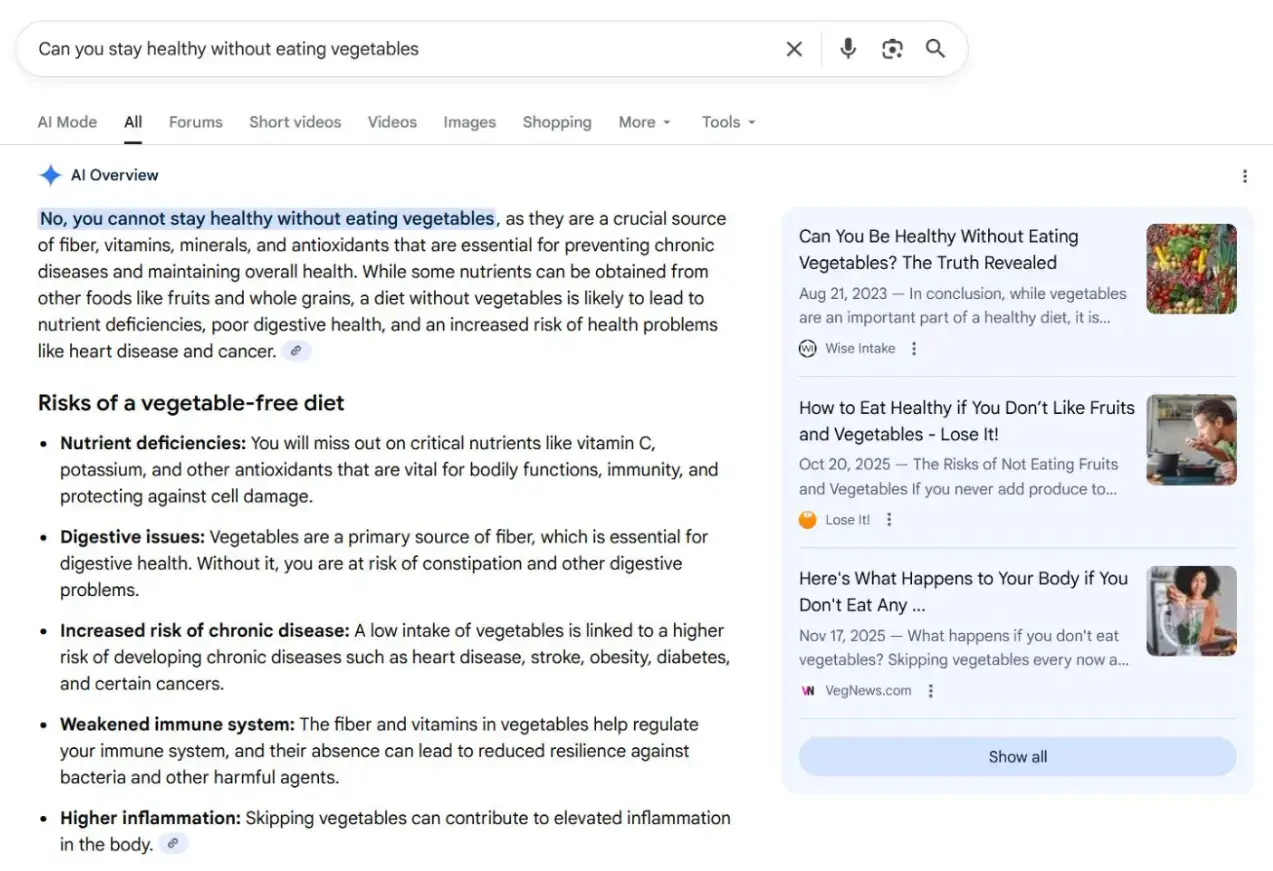 - Today’s AI-powered search: “How can I be healthy if I work night shifts?” Or: “Can you stay healthy without eating vegetables?” The result: an AI Overview, with well-targeted advice and solutions to your problem.