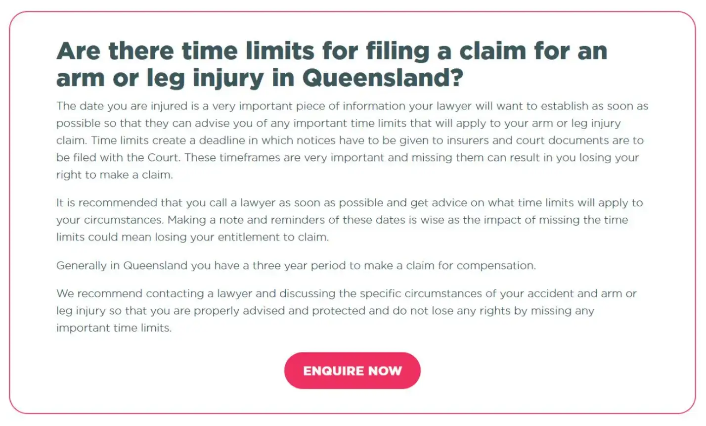 For this purpose, Trilby Misso Lawyers created situational pages (e.g., “I hurt my arm or leg”), including both long-tail and question keywords, such as: “Are there time limits for filing a claim for an arm or leg injury in Queensland?”