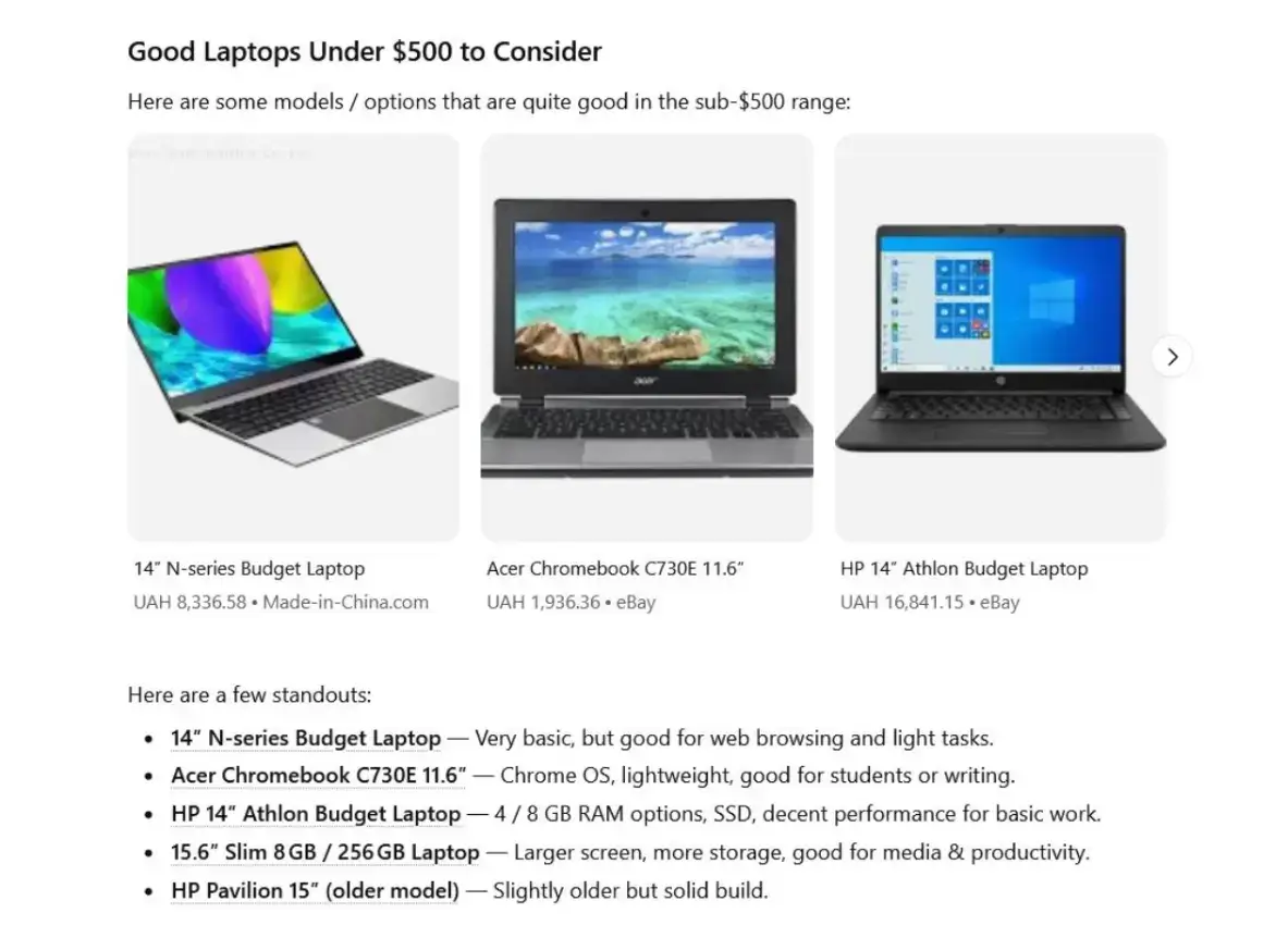 Regardless of which AI search engine they ask, they’ll receive a well-structured reply with prices, features, and models that fit the $500 budget.