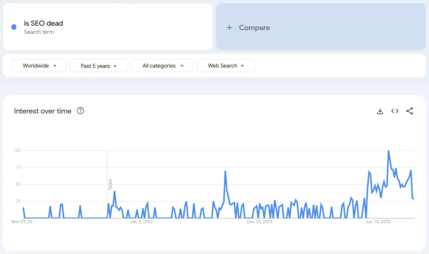 But things seem a little too real this time. As you can see from the Google Trends search below, interest in the topic has increased since AI-powered search engines and zero-click searches emerged.