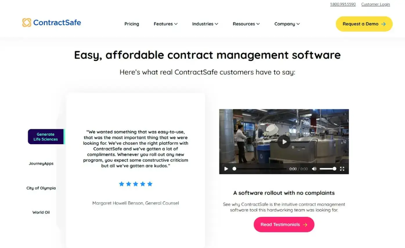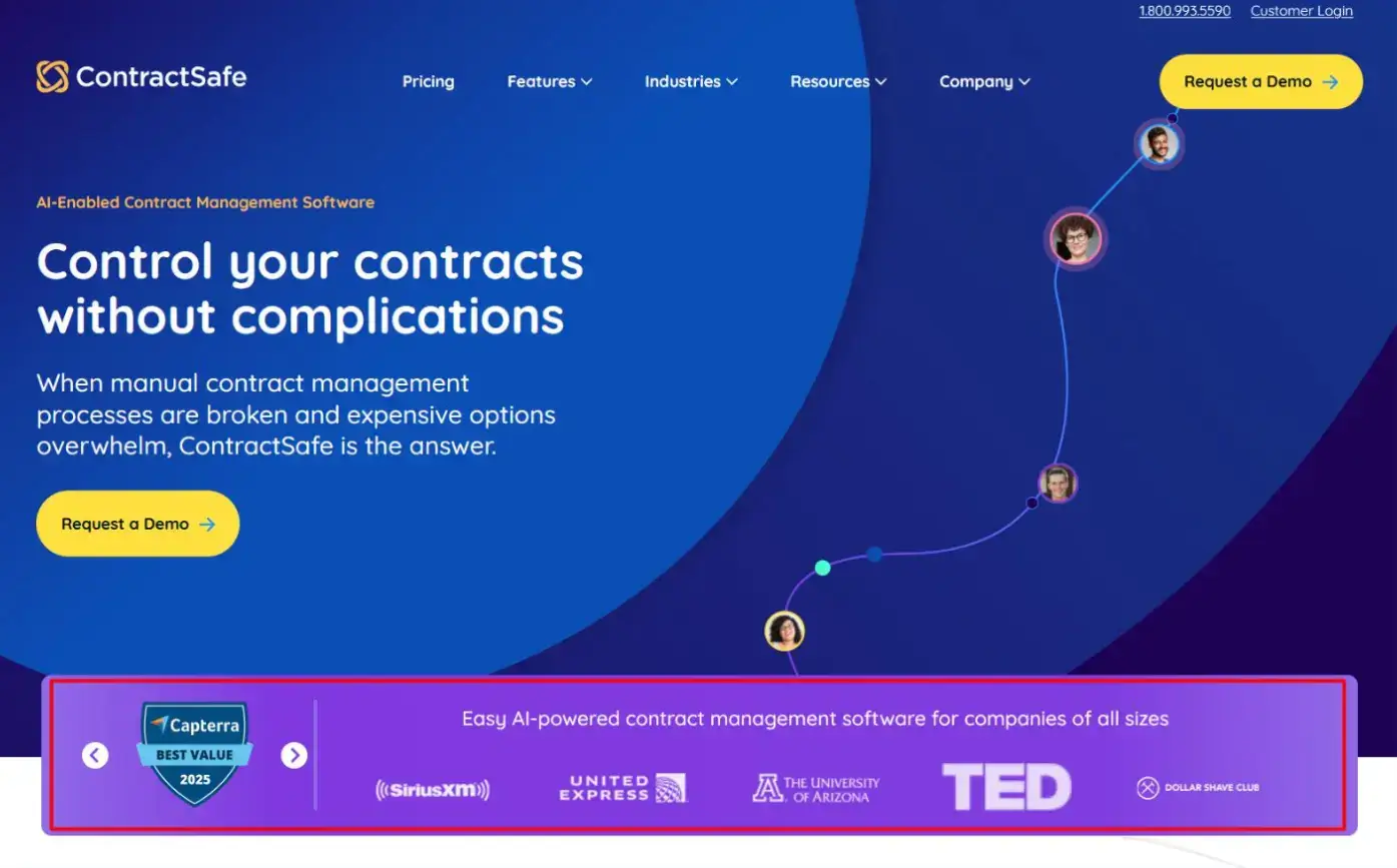Right above the fold, they added an image slider featuring awarded badges (e.g., “Best Ease of Use 2025” from Capterra) and a list of companies of all sizes that use their contract management software.