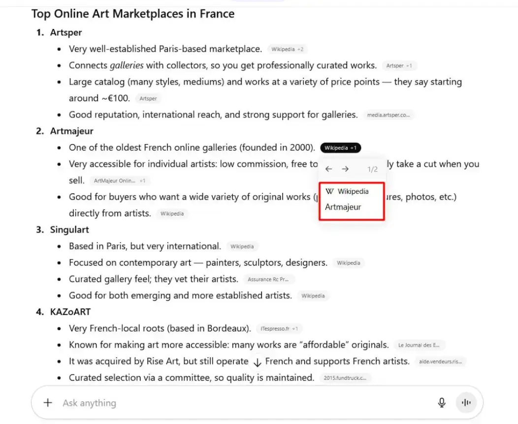 What Samuel is trying to say here is that each AI platform has its preferred citation sources. For instance, ChatGPT is like Wikipedia: when asked about the “best online art marketplace in France,” the platform lists ArtMajeur, citing its Wikipedia page.