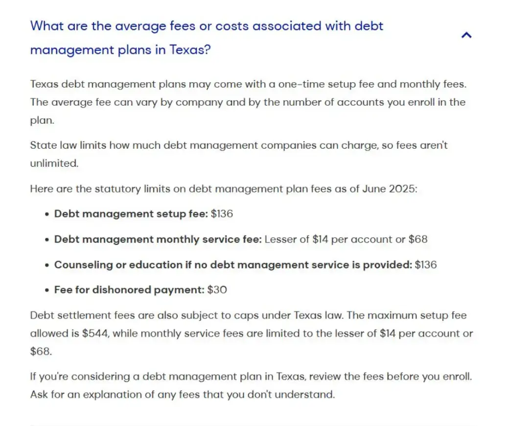 The company optimized the Texas debt relief guide with local FAQs, such as: “What are the average fees or costs associated with debt management plans in Texas?”
